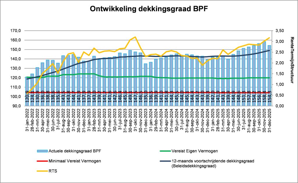 De actuele dekkingsgraad is gedaald van 158,4% eind november 2025 naar 154,3% eind december 2025.