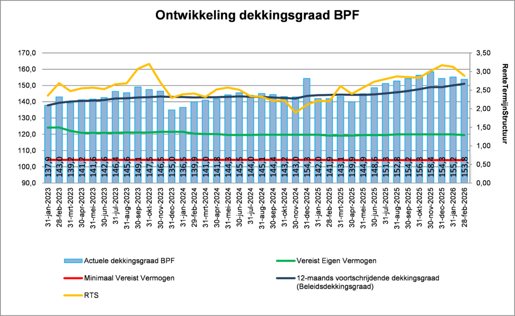 De actuele dekkingsgraad is gedaald van 155,2% eind januari 2026 naar 153,8% eind februari 2026.