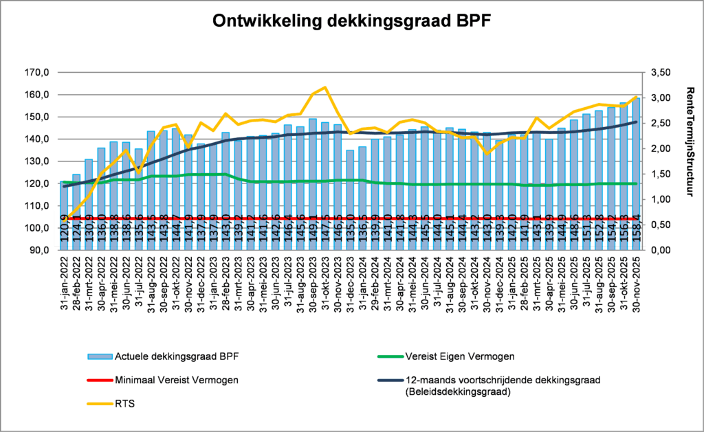 De actuele dekkingsgraad is gestegen van 156,3% eind oktober 2025 naar 158,4% eind november 2025.